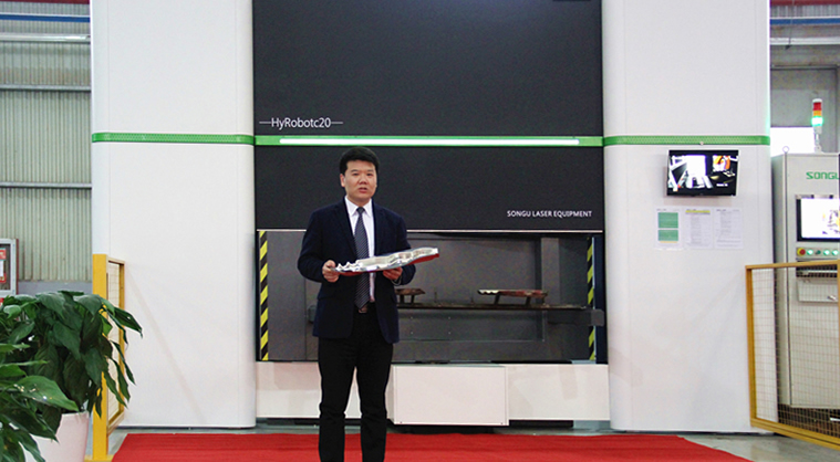 儀式現場,HyRobot C20三維光纖激光切割機器人實時同步顯示的屏幕上,高精密工業機器人手臂搭載具有智能隨動功能的激光切割頭,按照既定路徑,動作平穩流暢地對各種汽車金屬工件進行精密切割。隨著激光的火花四濺,松谷激光李正上副總經理宣布HyRobot C20三維光纖激光切割機器人正式量產下線。