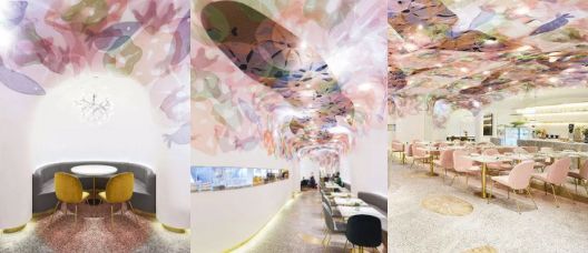 BLUFISH餐廳的設計師選擇了6種具有童話感的輕松而溫暖的手繪圖形,代表海中的珊瑚、水草和魚群,并用金屬光纖激光切割機切割金屬網來制作這些圖案,將之疊加在白色的曲面造型之上,營造出水下所特有的絢爛、半透明、不穩定的視覺效果。