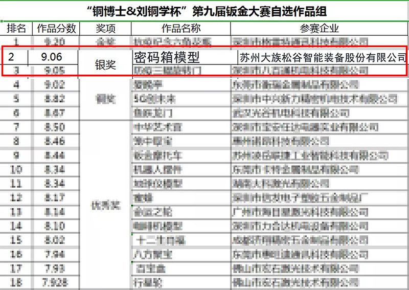 2020年11月11-15日,由深圳市鈑金加工行業協會主辦的“銅博士&劉銅學杯”第九屆鈑金工藝設計與制作大賽在深圳會展中心進行評選和參展,經過國內外鈑金專業資深專家、學者和業界企業家們的評審,蘇州松谷激光榮獲此次大賽銀獎。