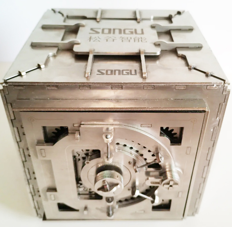 此次,蘇州松谷激光參賽作品--密碼箱模型--由Wind風速系列光纖激光切割機切割數百塊不同形狀的板材、齒輪,齒條等零件,采用榫卯結構組合而成。復雜程度大,精密程度高。在Wind風速系列光纖激光切割機精細切割下,各零部件間環環相扣、緊緊相連,完美的嵌合在一起。